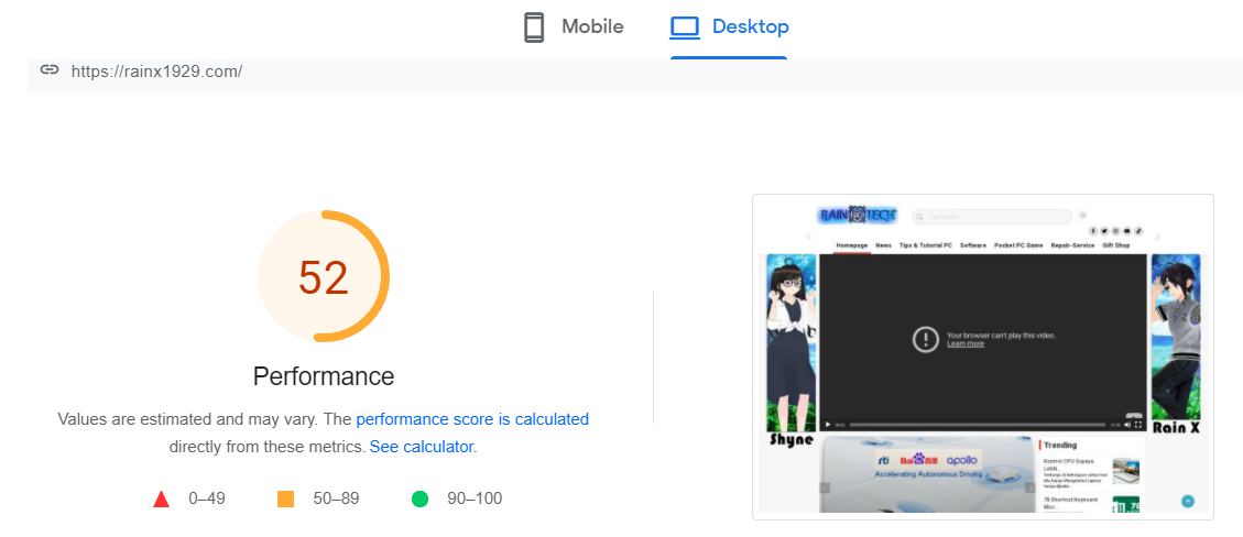 Nah disini admin mendapatkan Penilaian 52 , maka website sudah tergolong standard. Dengan begitu,jika nilai 90-10 kalian bisa yakin bahwa Google akan memberikan ranking yang lebih tinggi dipencarian. Semoga bermanfaat ya.